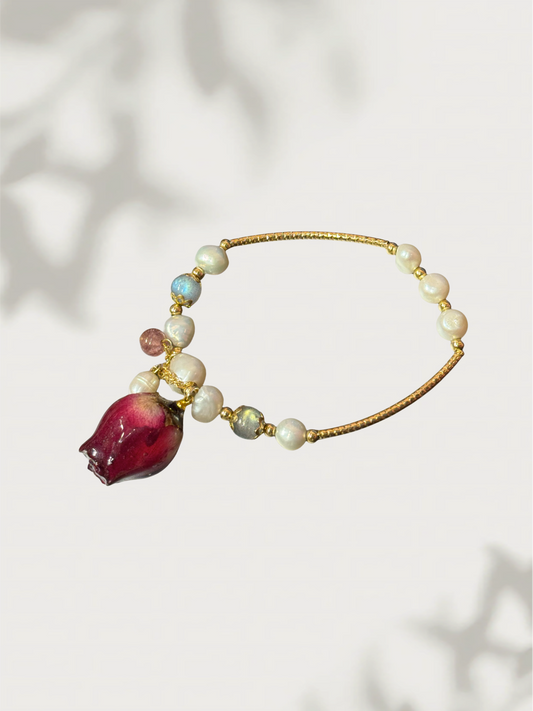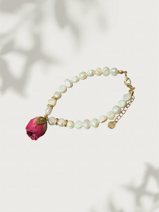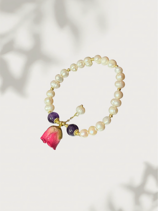 Roseate Elegance: Freshwater Pearls Bracelet with Five Rose Quartz Designs and Red Rose Pendant